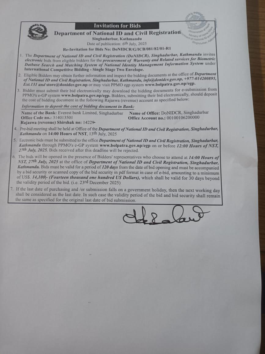 Re-Invitation for Bids No:DoNIDCR/G/ICB/081/82/01-R1 |