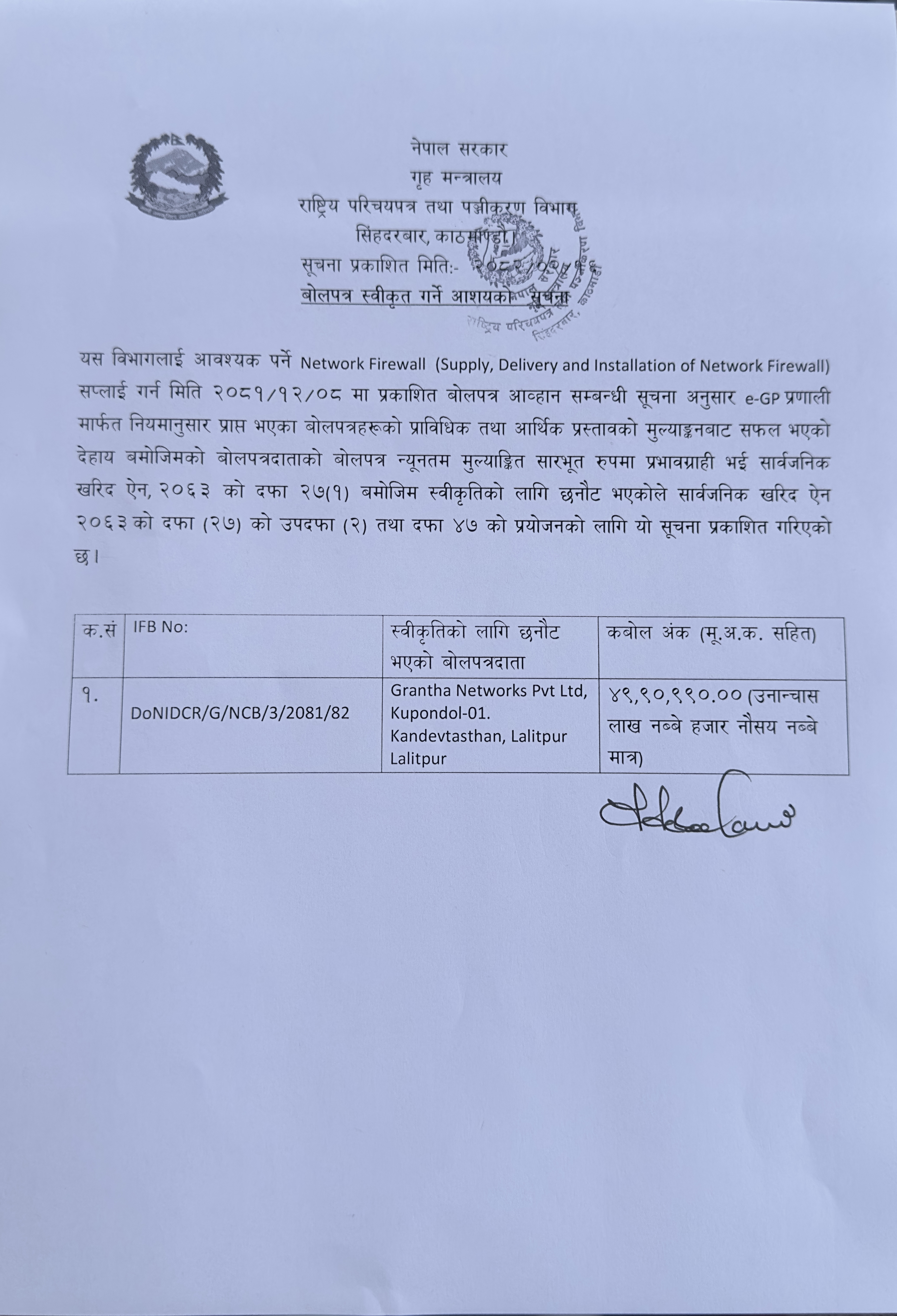बोलपत्र स्वीकृत गर्ने आशयको सूचना |