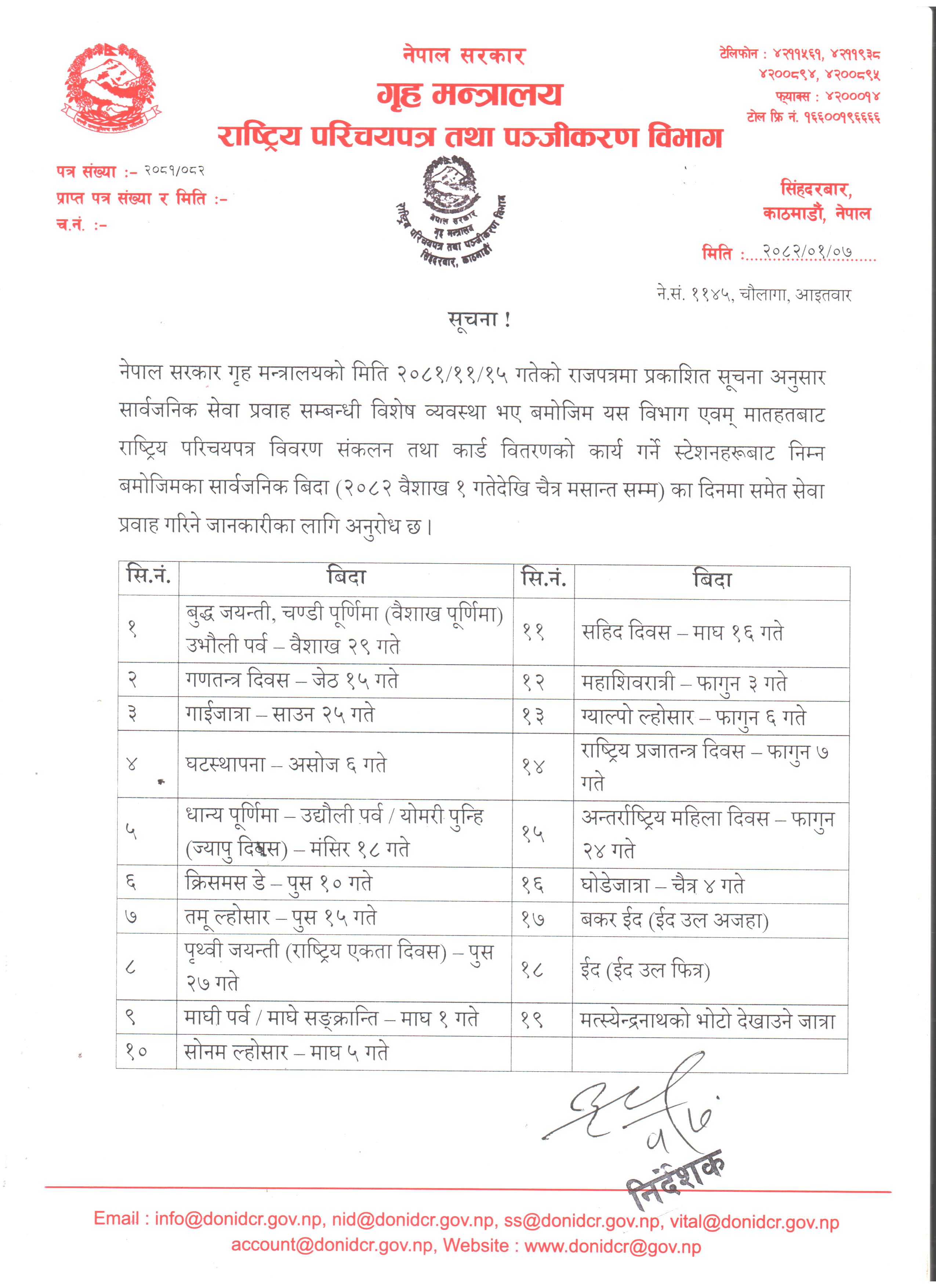 सार्वजनिक बिदाको दिनमा समेत सेवा प्रवाह सम्बन्धी सूचना (२०८२ साल) |