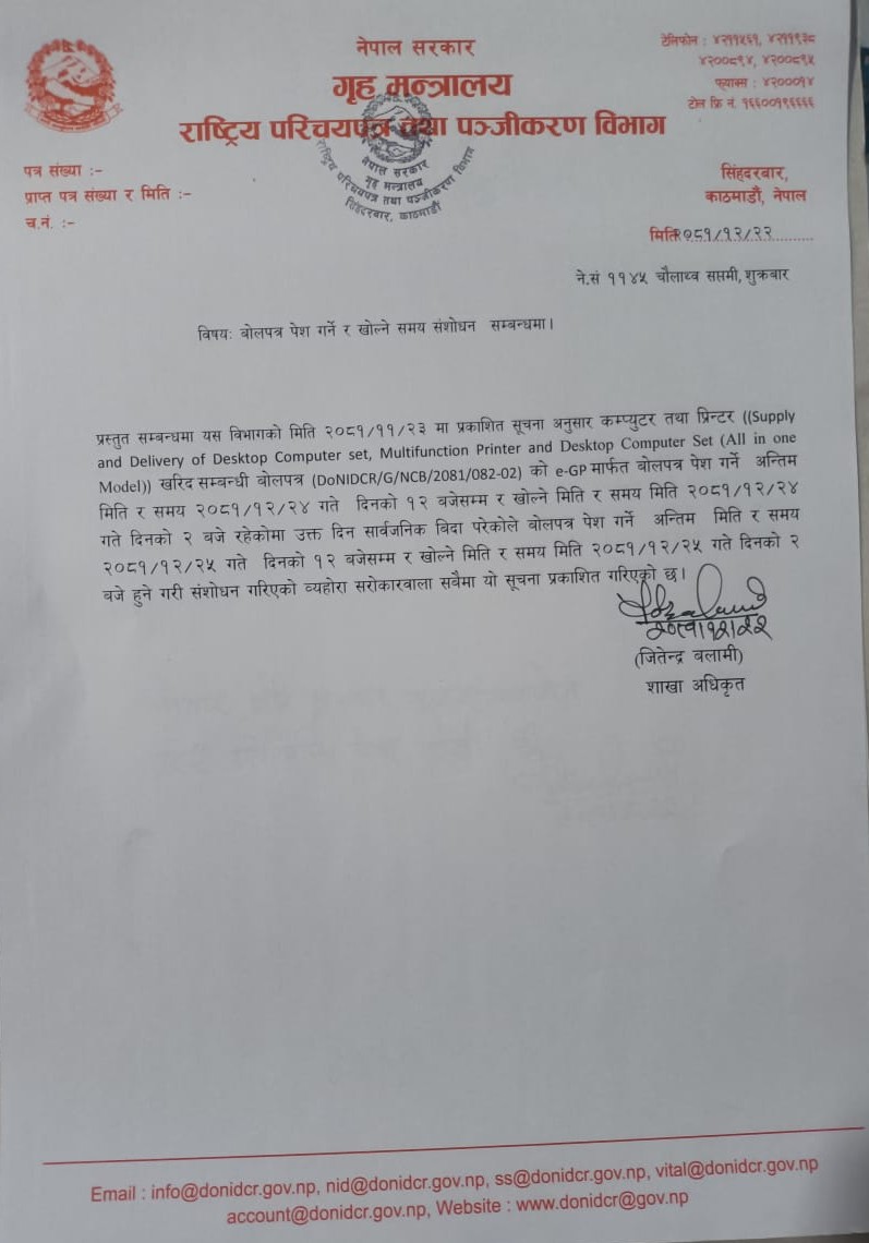 बोलपत्र पेश गर्ने र खोल्ने समय संसोधन सम्बन्धमा |