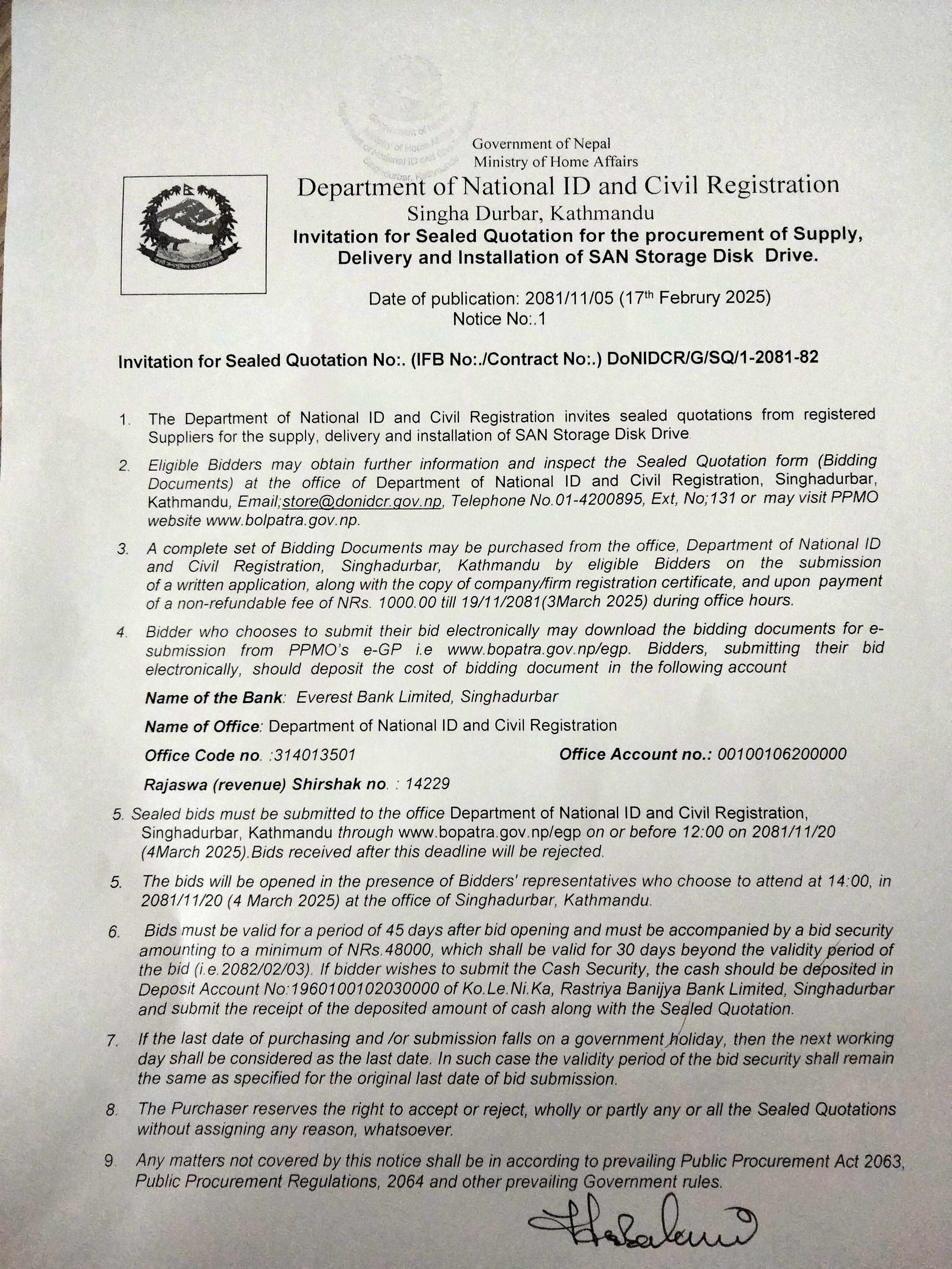 Invitation for Sealed Quotation for the procurement of supply, delivery and installation of SAN storage Disk Drive |