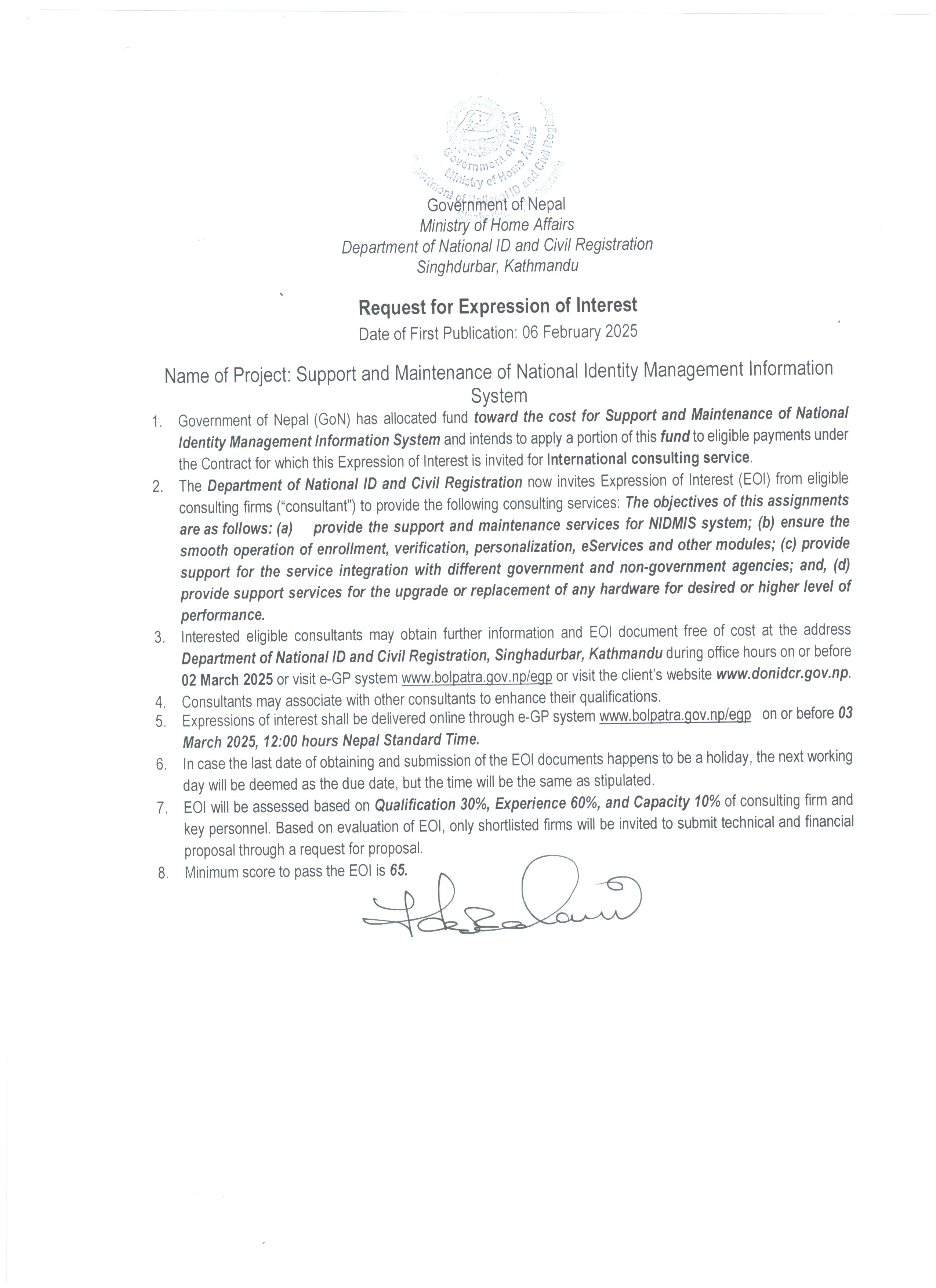 Support and Maintenace of National Identity Management Information System |
