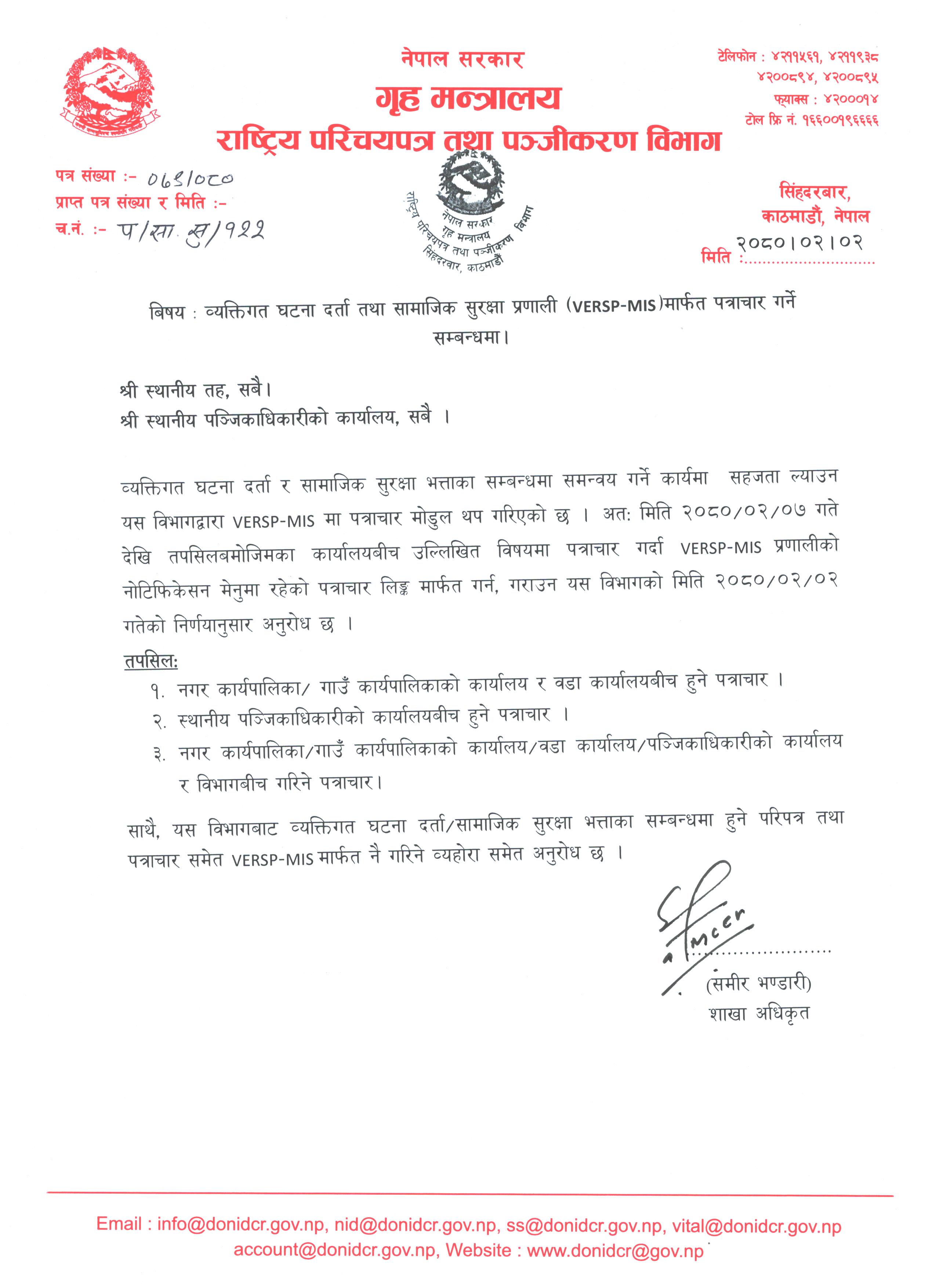 VERSP-MIS मार्फत पत्राचार गर्ने सम्बन्धमा । |