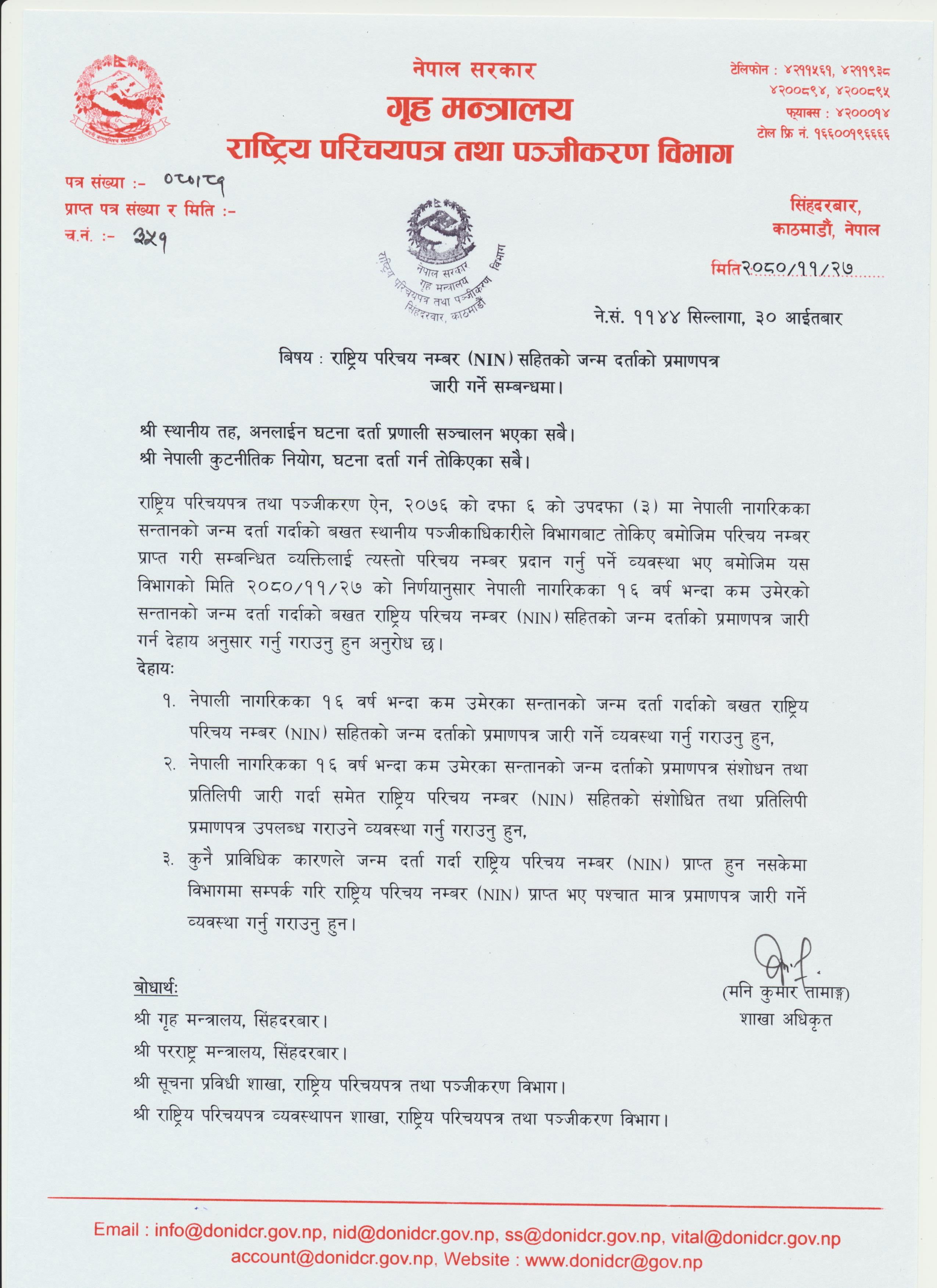 राष्ट्रिय परिचय नम्बर (NIN) सहितको जन्म दर्ताको प्रमाणपत्र जारी गर्ने सम्बन्धमा । |
