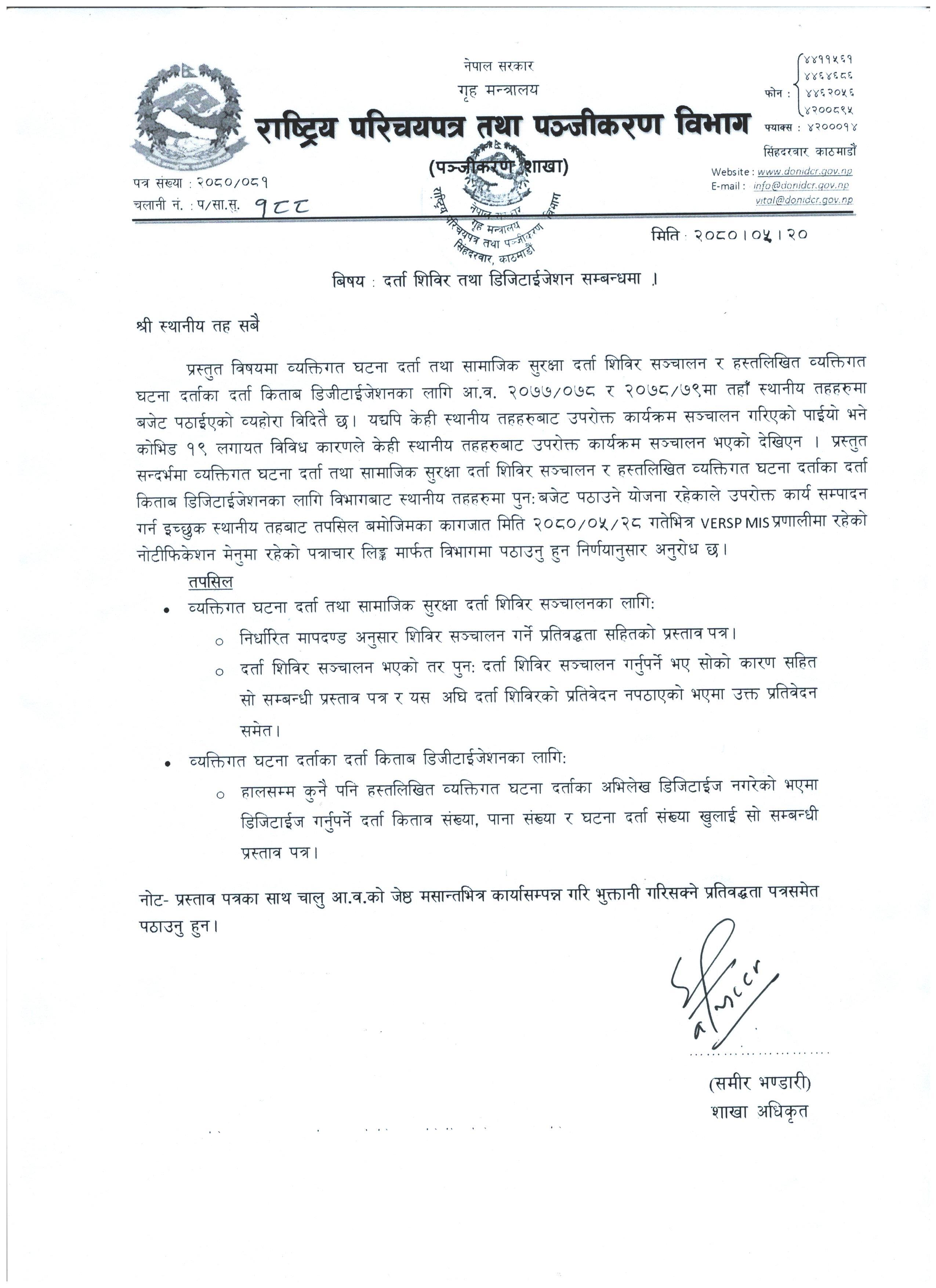 डिजिटाइजेसन र दर्ता शिविर संचालनको लागी बजेट माग सम्बन्धी |