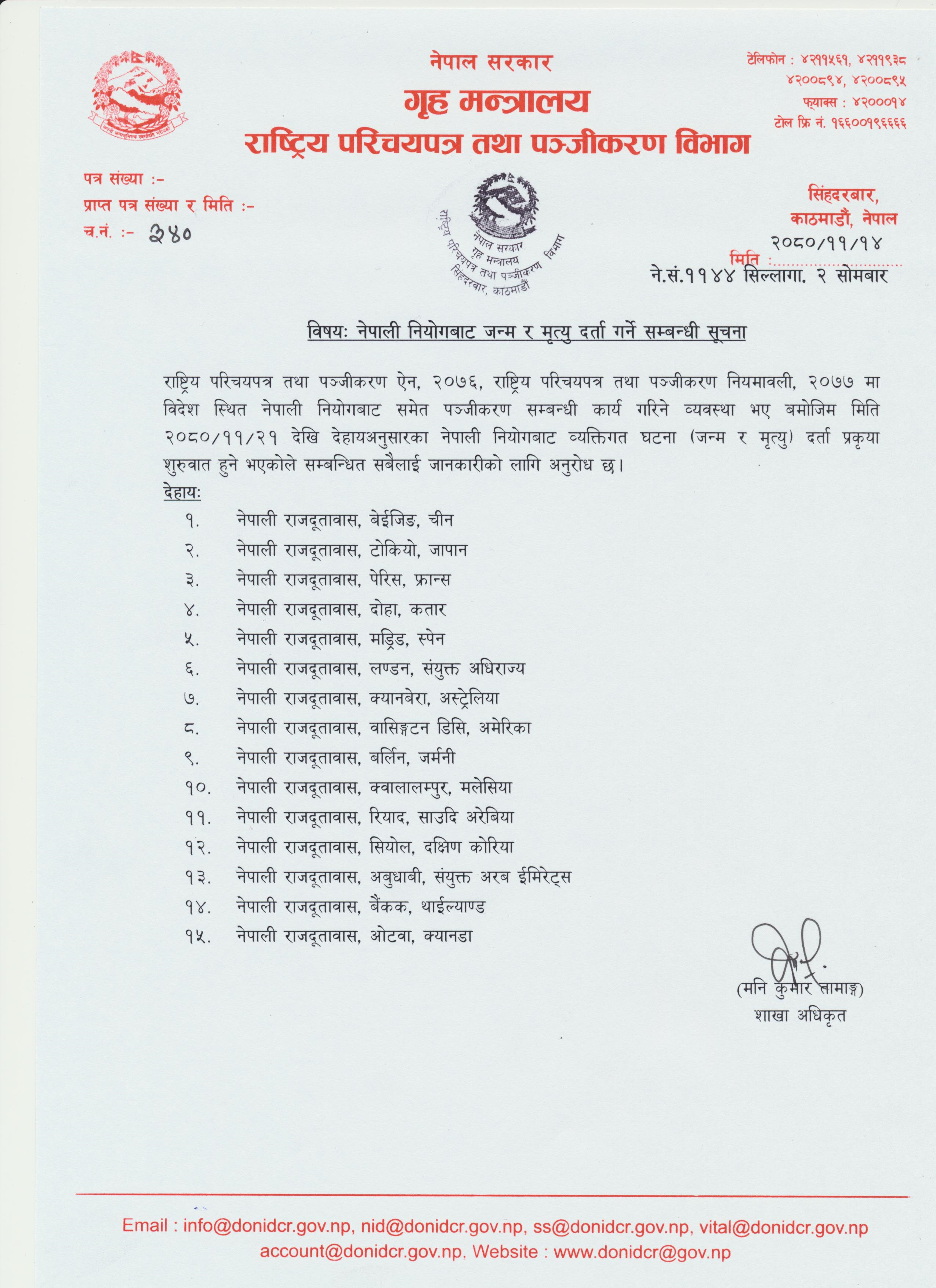 नेपाली नियोगबाट जन्म र मृत्यु दर्ता गर्ने सम्बन्धी सूचना |