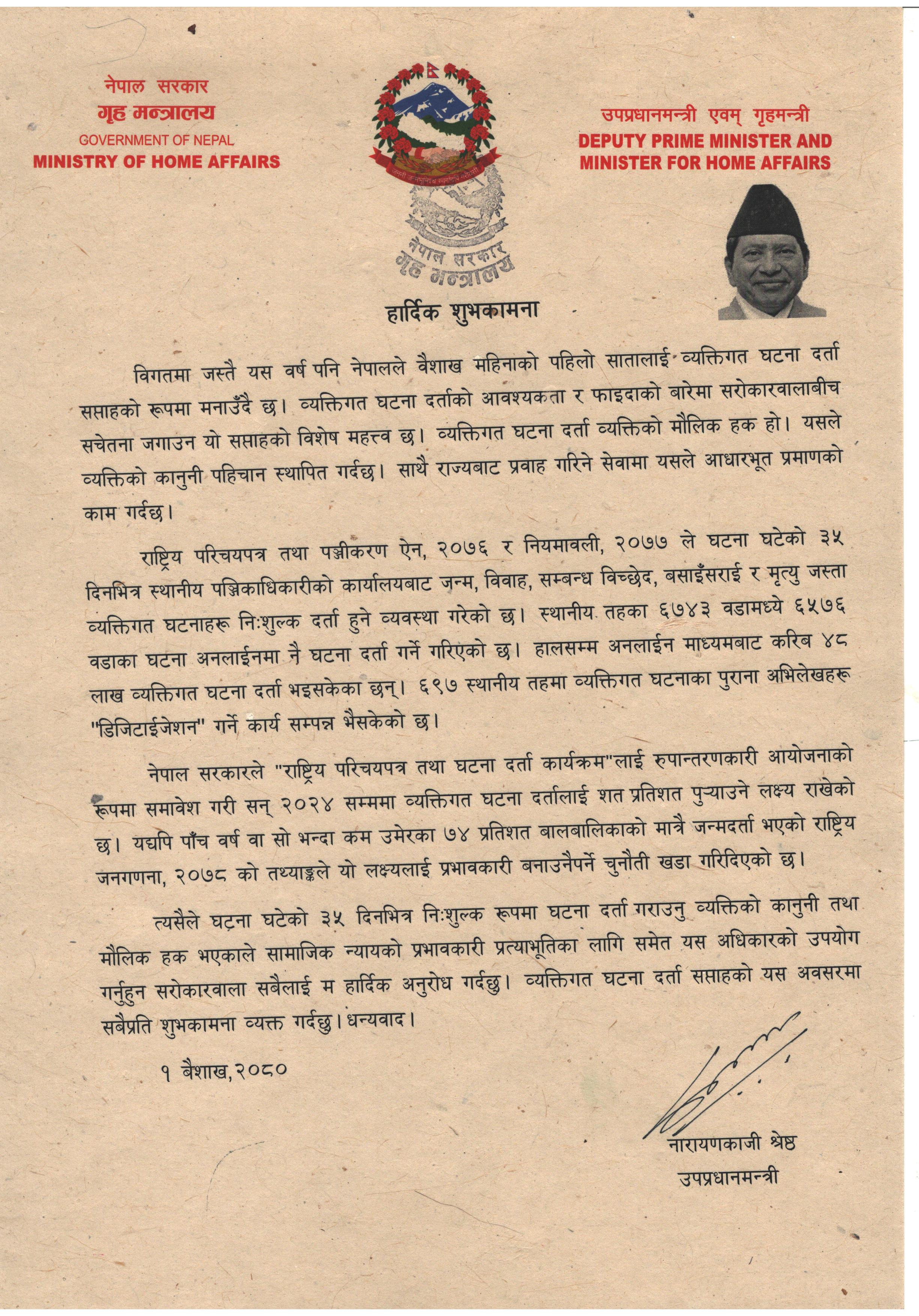 माननीय उपप्रधानमन्त्री एवम् गृह मन्त्री ज्यूको व्यक्तिगत घटना दर्ता सप्ताहको शुभकामना सन्देश |