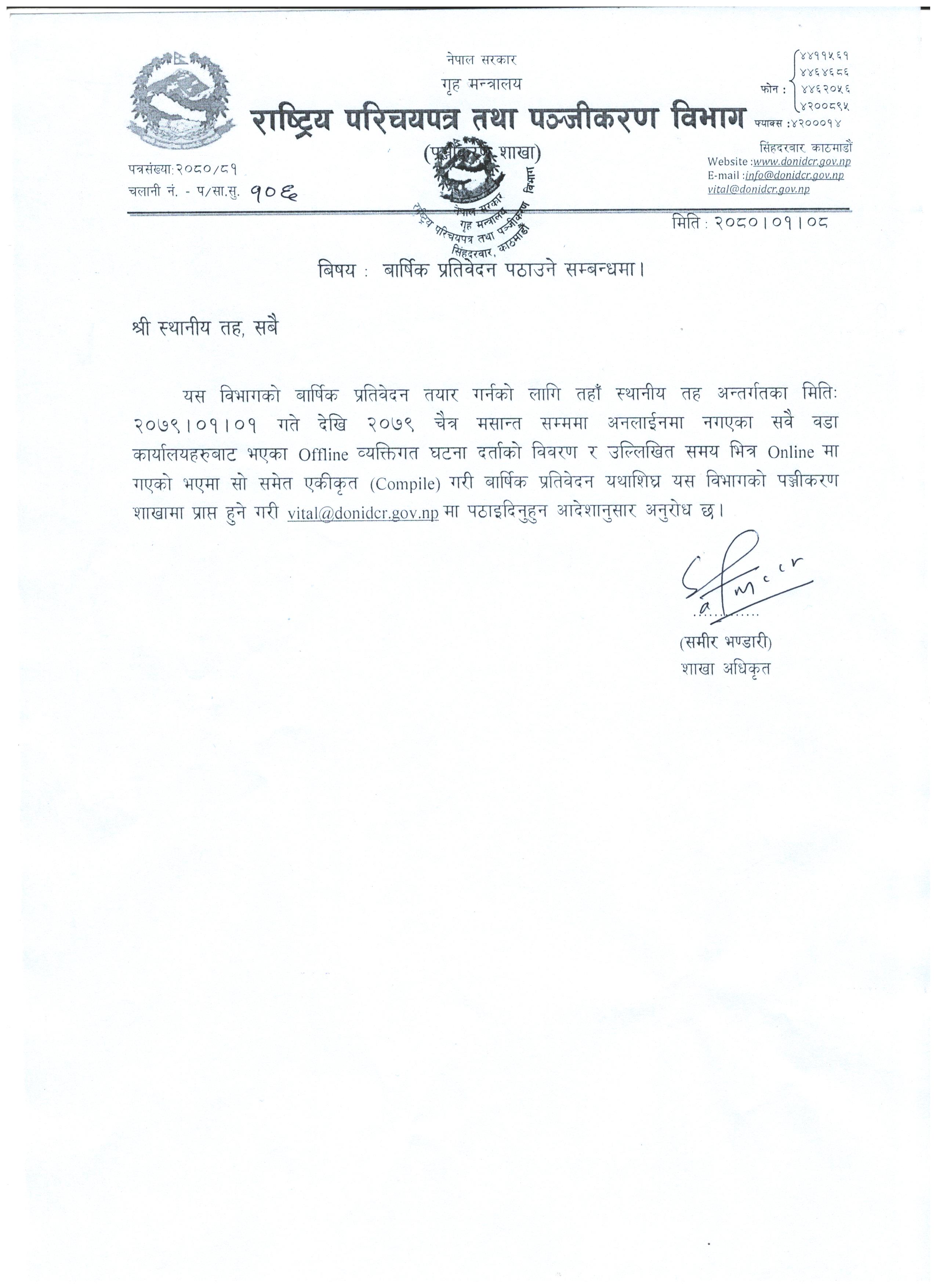 बार्षिक प्रतिवेदन पठाउने सम्बन्धमा। |