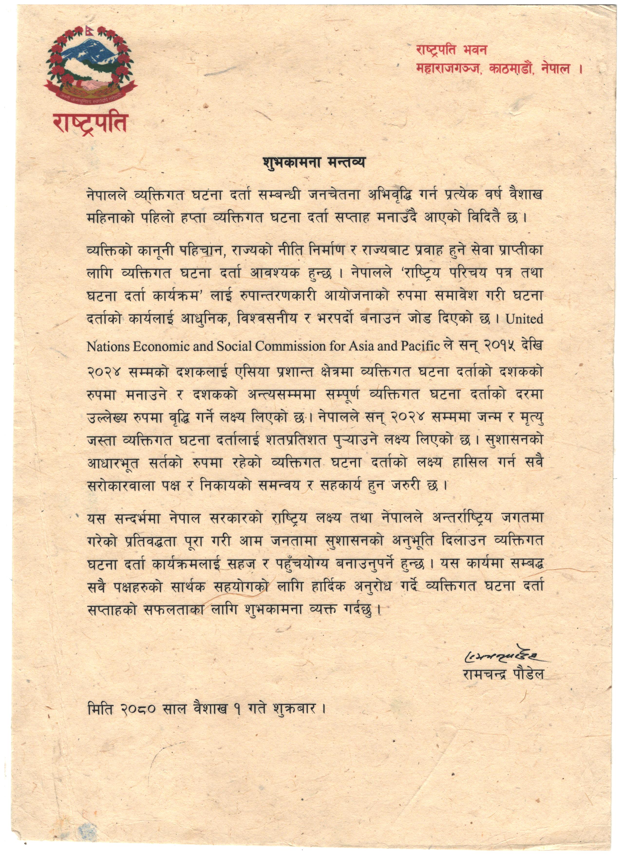 सम्माननीय राष्ट्रपति ज्यूको व्यक्तिगत घटना दर्ता सप्ताह सम्बन्धी शुभकामना सन्देश |