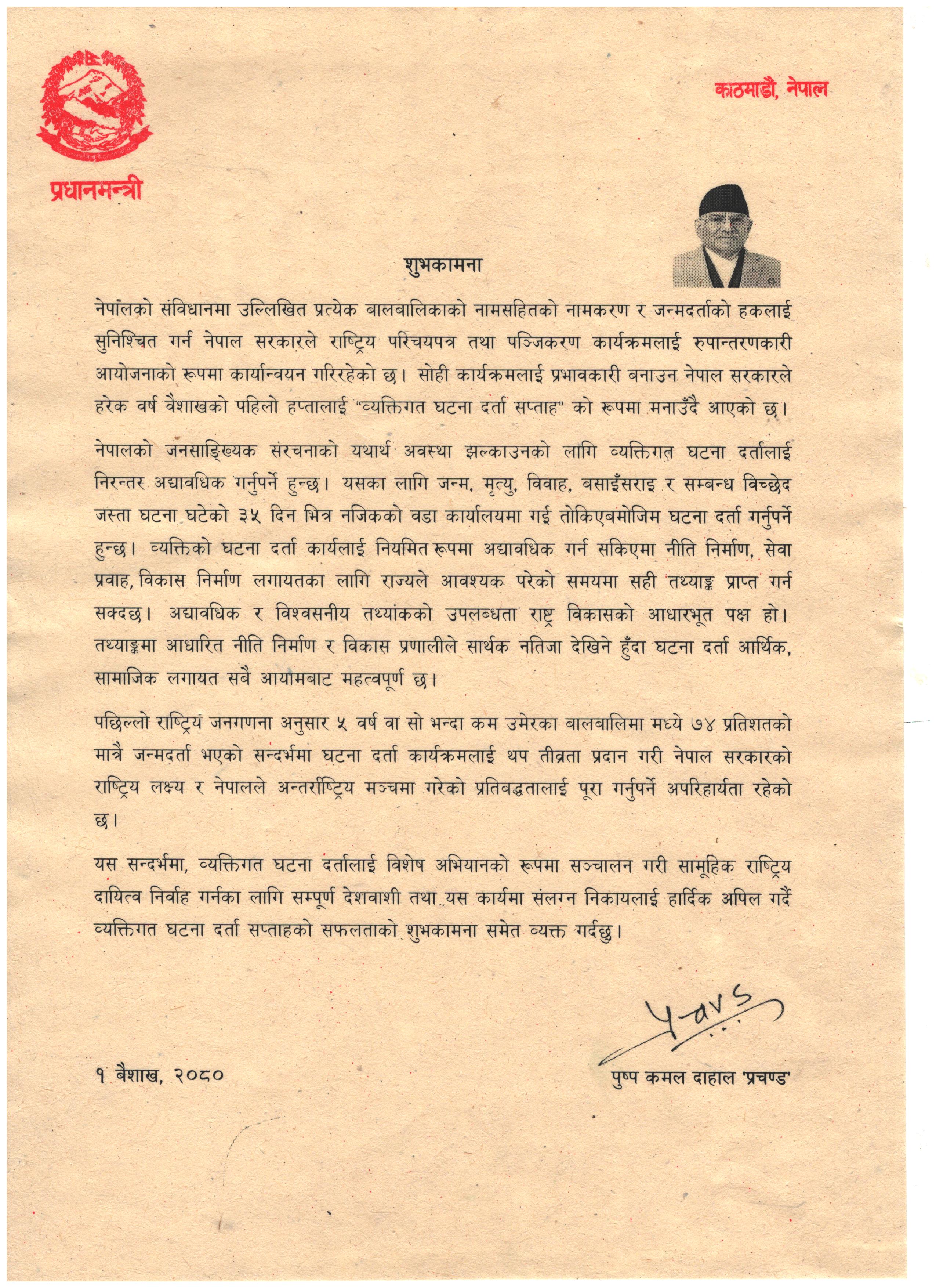 सम्माननीय प्रधानमन्त्री ज्यूको व्यक्तिगत घटना दर्ता सप्ताहको शुभकामना सन्देश |