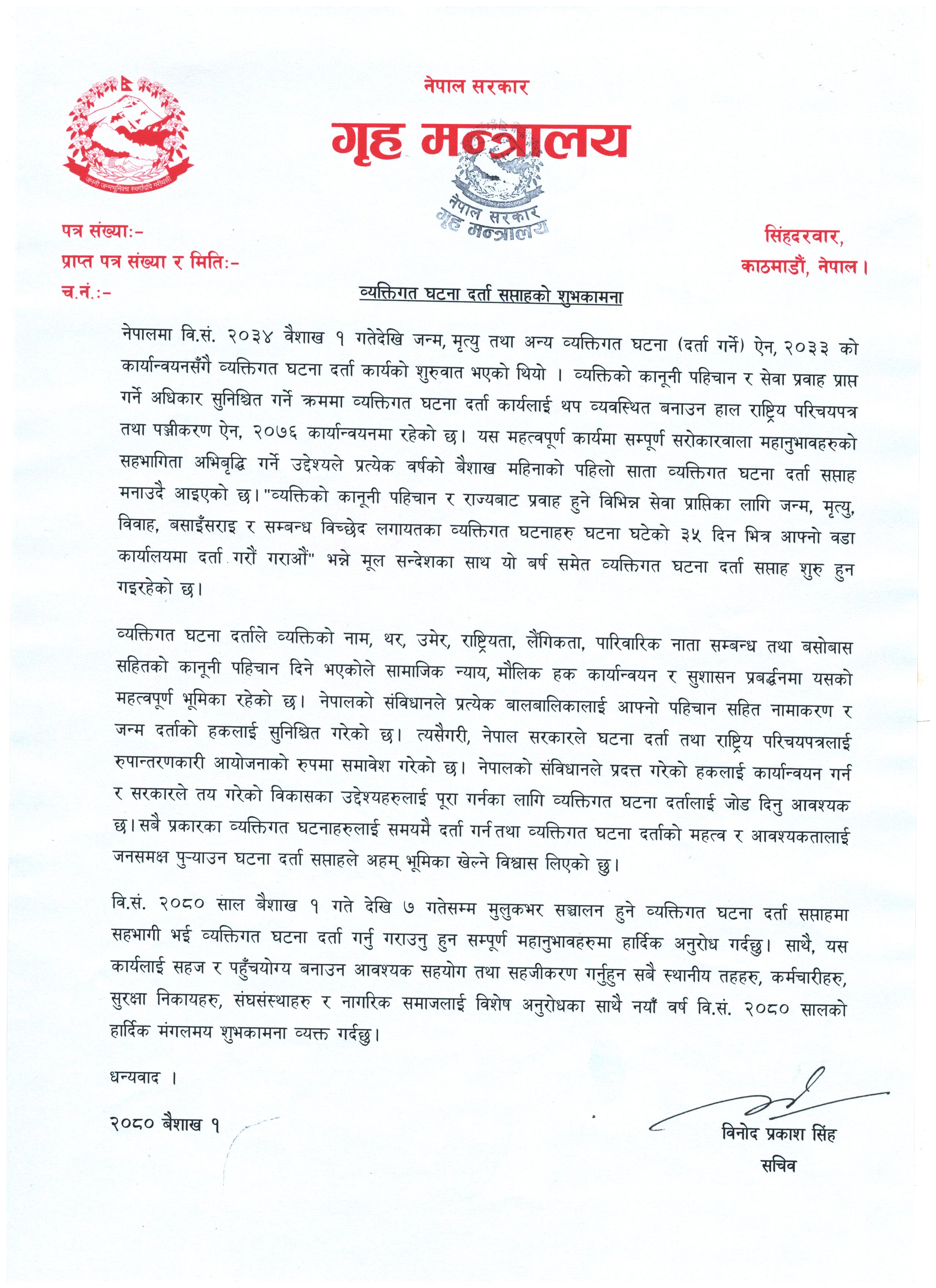 गृह सचिव ज्यूको व्यक्तिगत घटना दर्ता सप्ताहको शुभकामना सन्देश |