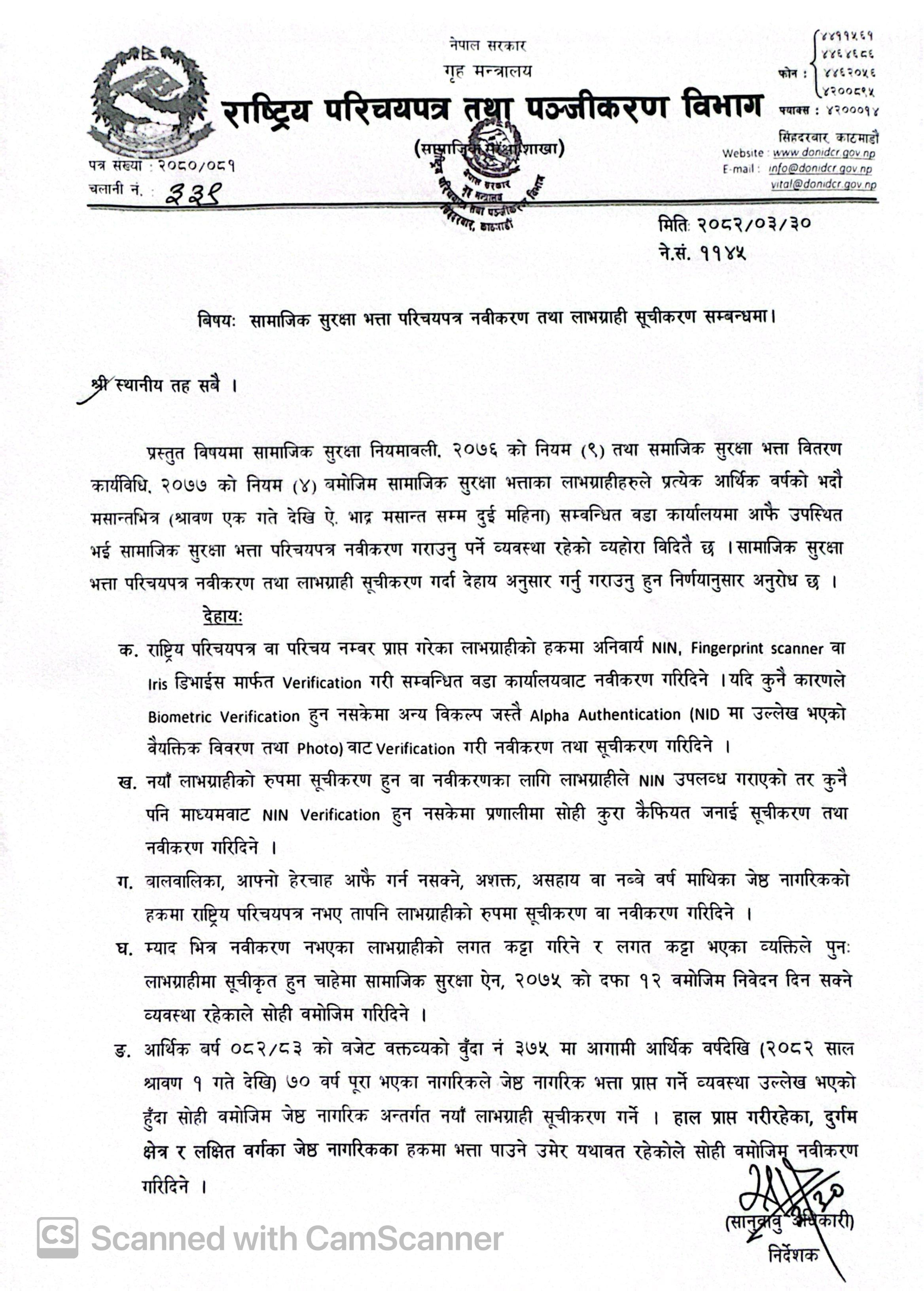 5 सामाजिक सुरक्षा भत्ता परिचयपत्र नविकरण तथा लाभग्राही सूचीकरण सम्बन्धमा। असार ३०, २०८२, सोमबार १४:१९