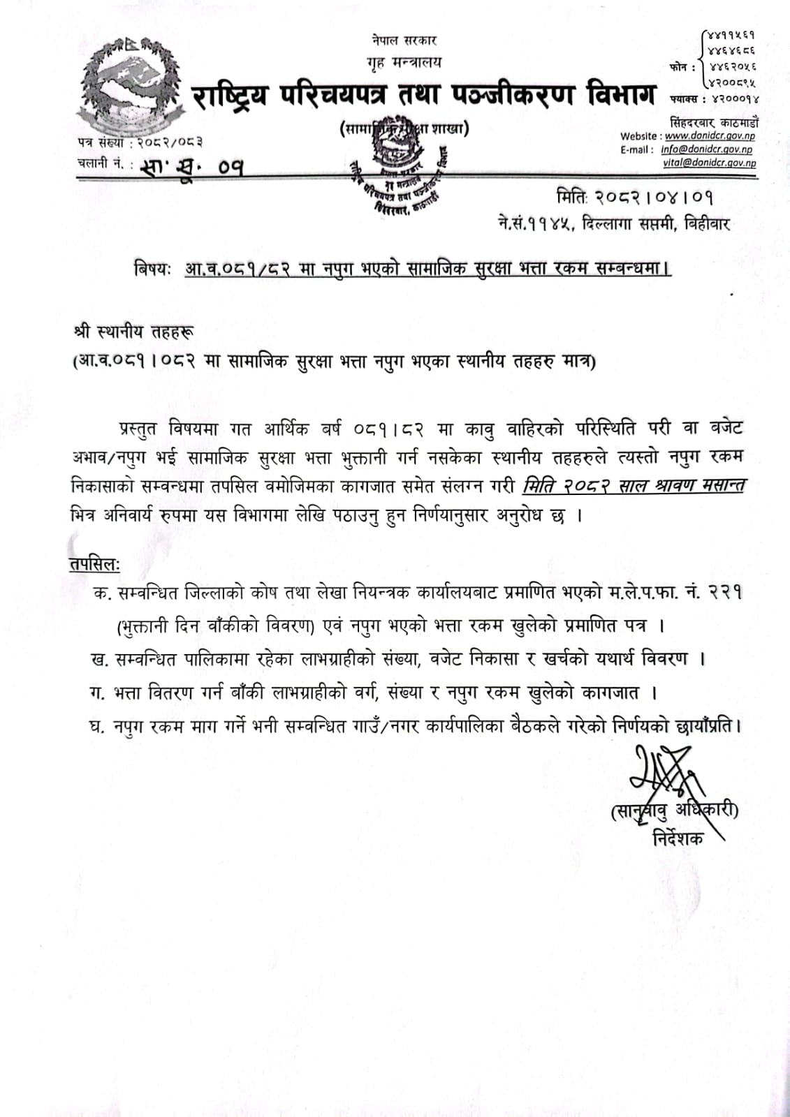 4 आ.व. ०८१/८२ मा नपुग भएको सामाजिक सुरक्षा भत्ता रकम सम्बन्धमा। साउन १, २०८२, बिहिबार १४:२०
