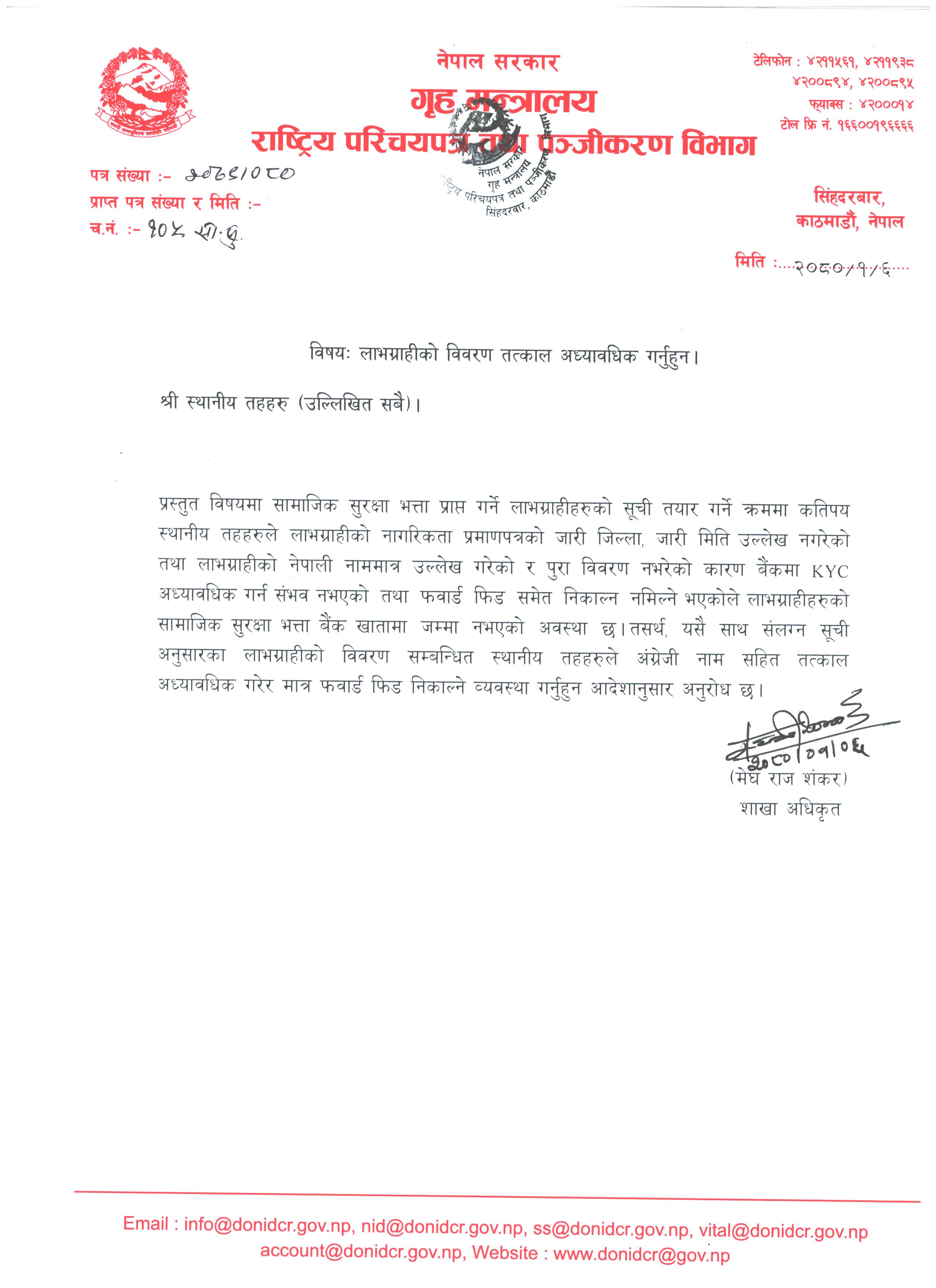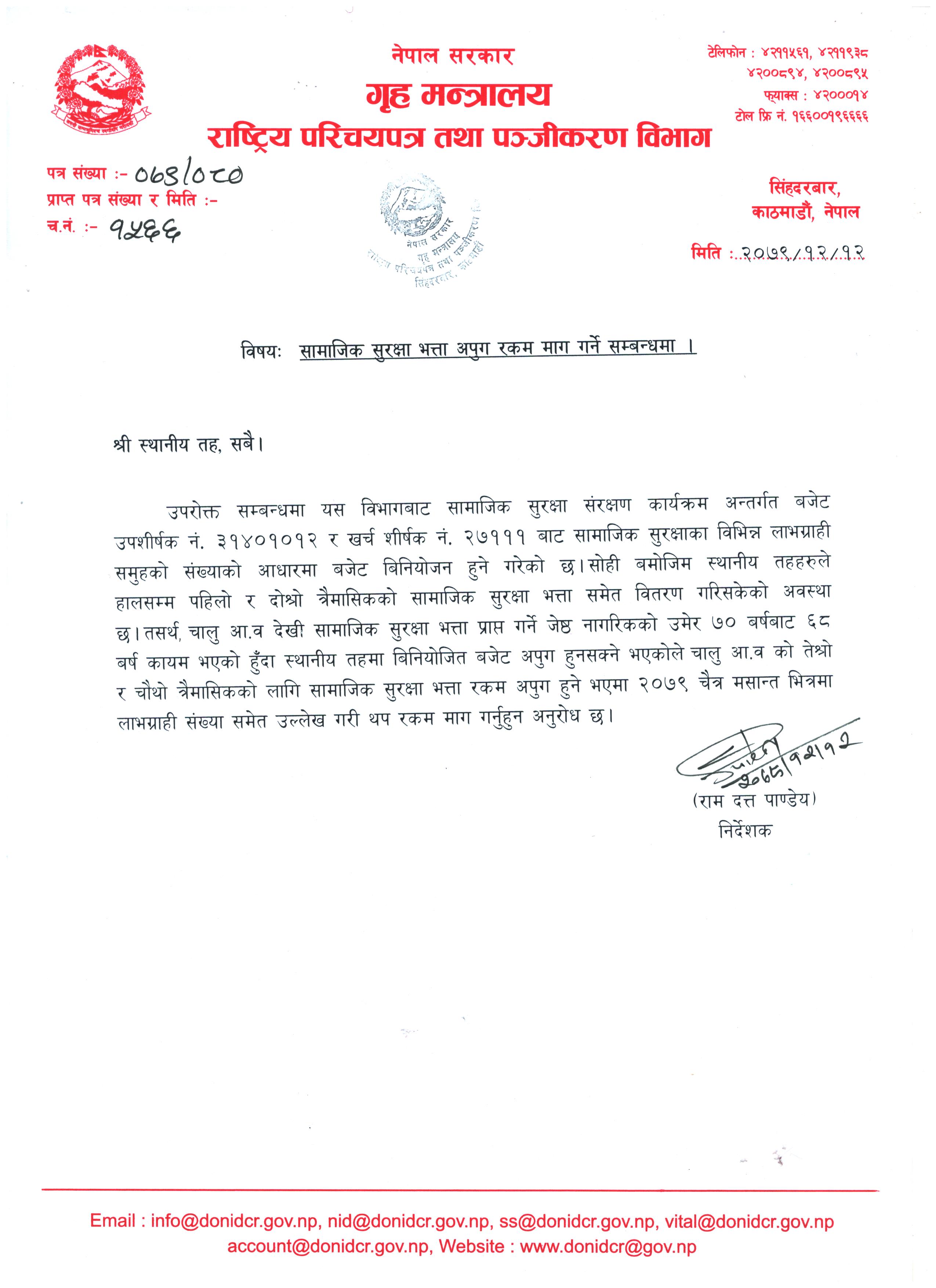 सामाजिक सुरक्षा भता अपुग रकम माग गर्ने सम्बन्धमा । |