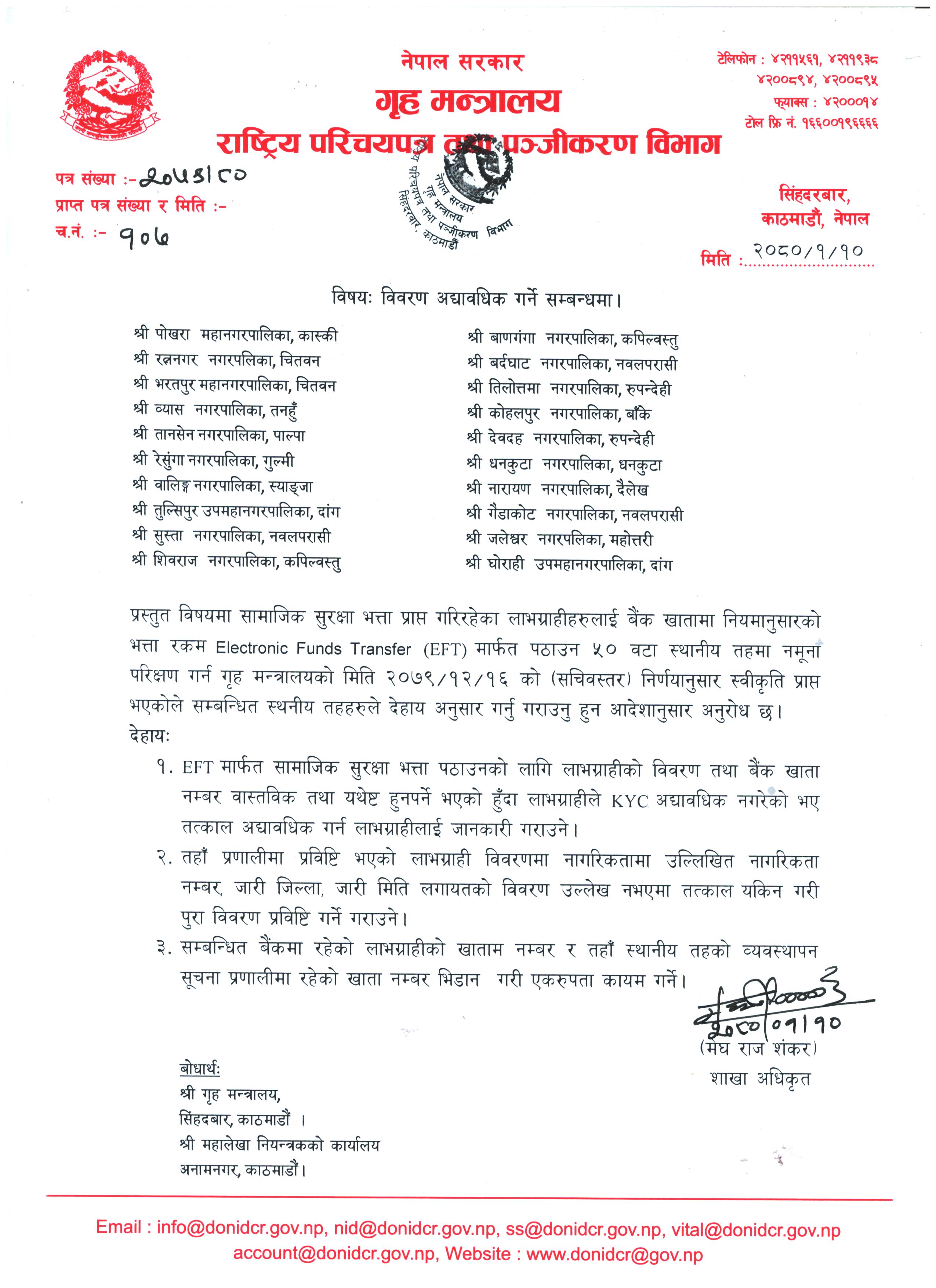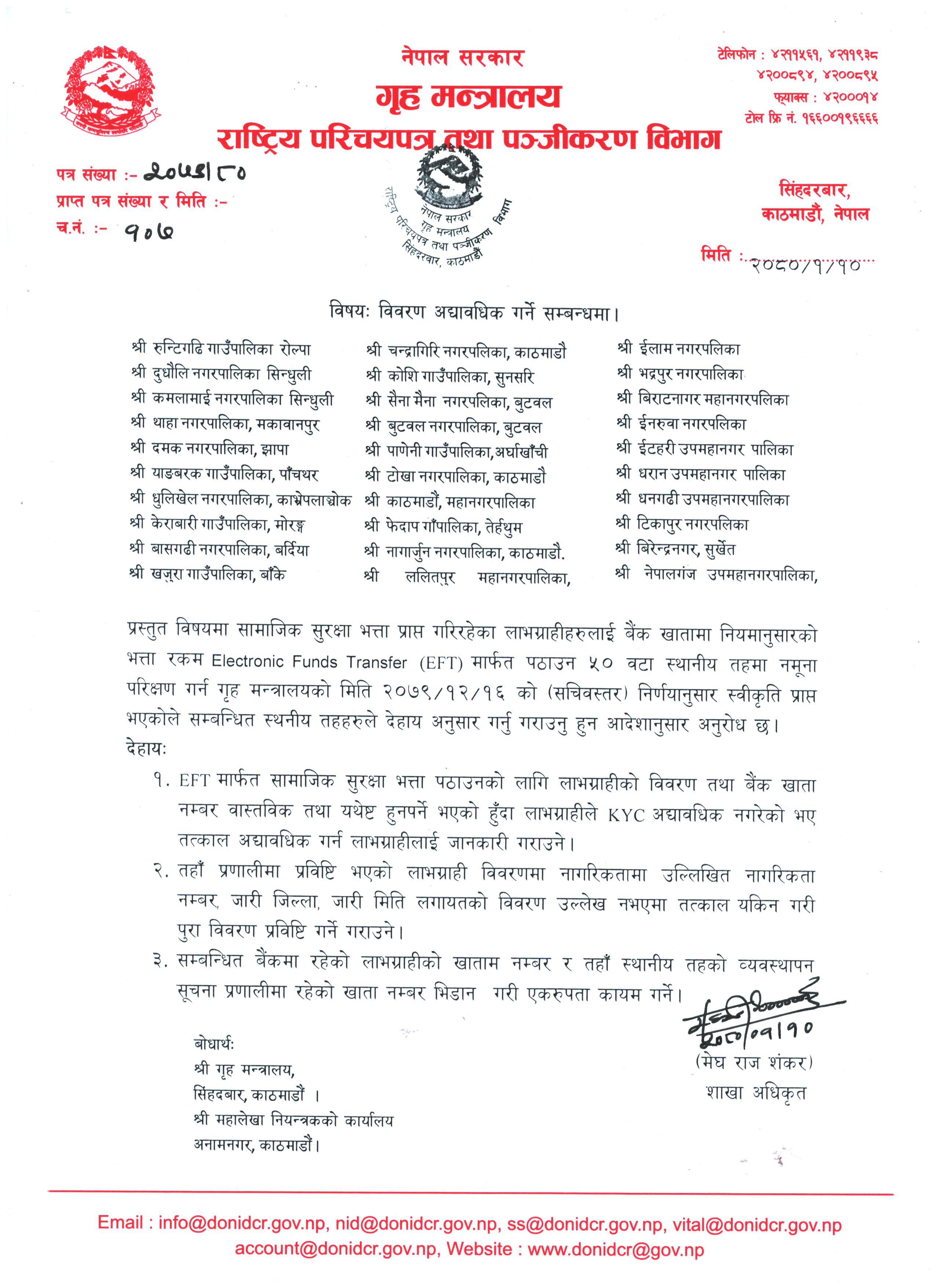सामाजिक सुरक्षा भता विद्युतीय माध्यमबाट (EFT) मार्फत भूक्तानि सम्बन्धमा (सम्बन्धित ३० स्थानीय तह ) |