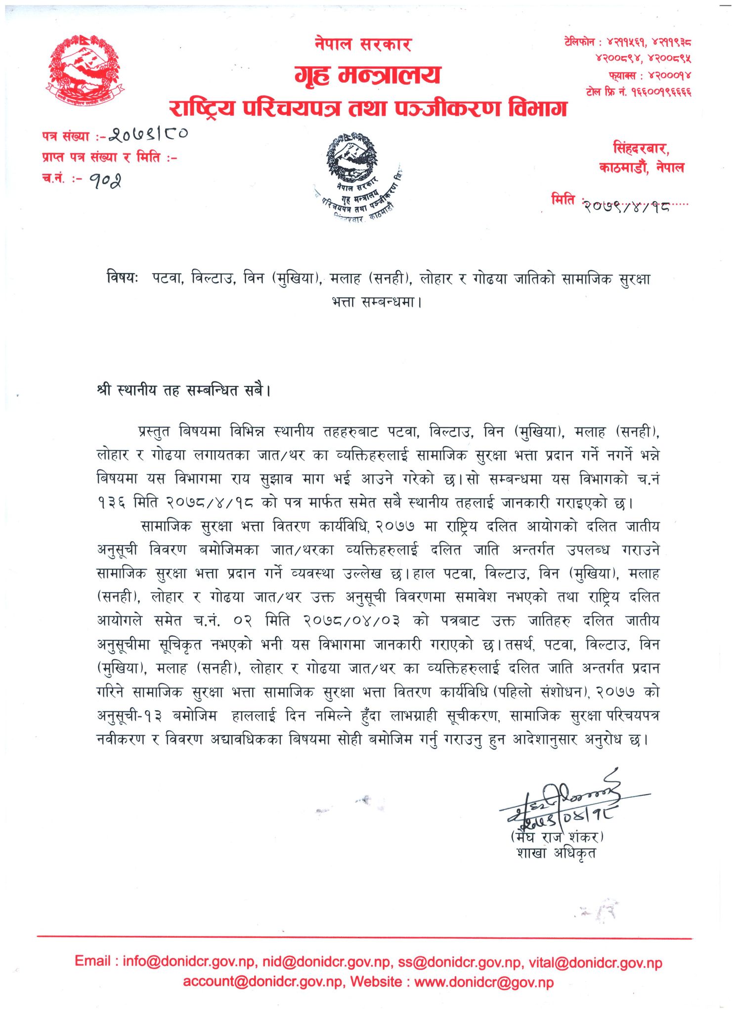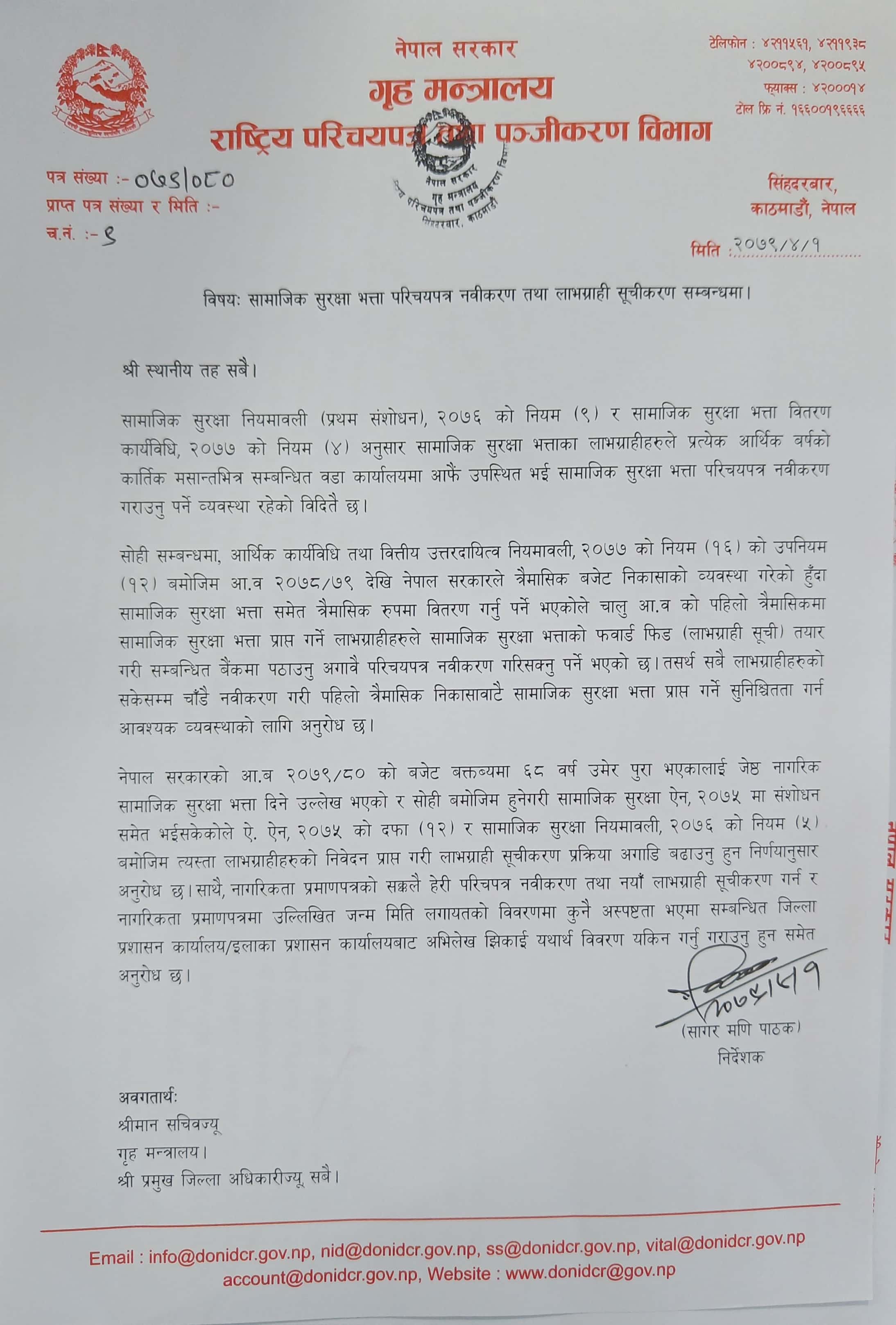 सामाजिक सुरक्षा भत्ता परिचयपत्र नवीकरण तथा लाभग्राही सूचीकरण सम्बन्धमा । |