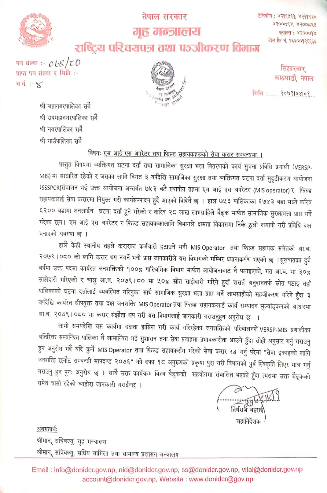 एम आई एस अपरेटर तथा फिल्ड सहायकहरुको सेवा करार सम्बन्धमा | |