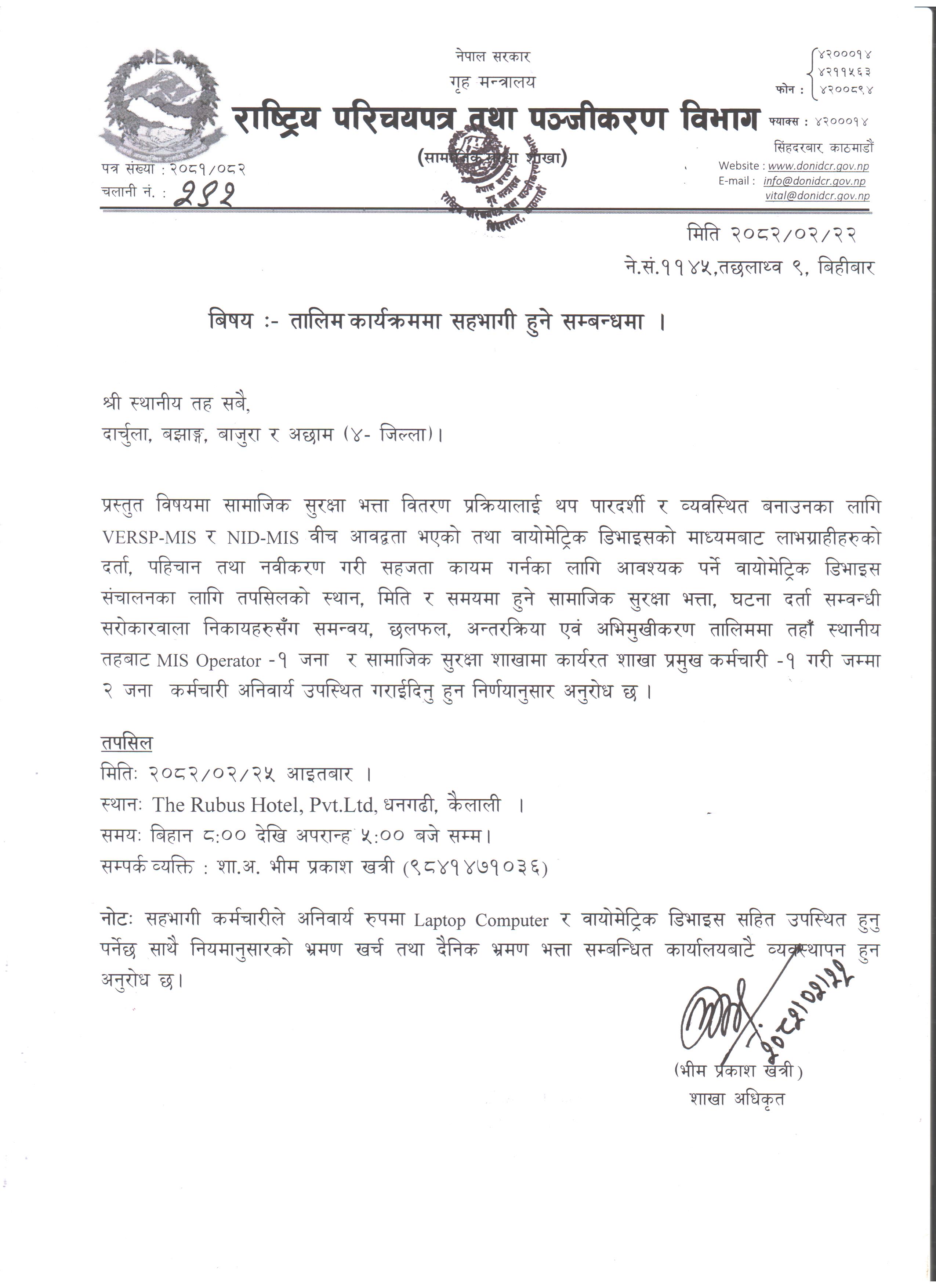 तालिम कार्यक्रममा सहभागी हुने सम्बन्धमा (दार्चुला बझाङ्ग बाजुरा अछाम) |