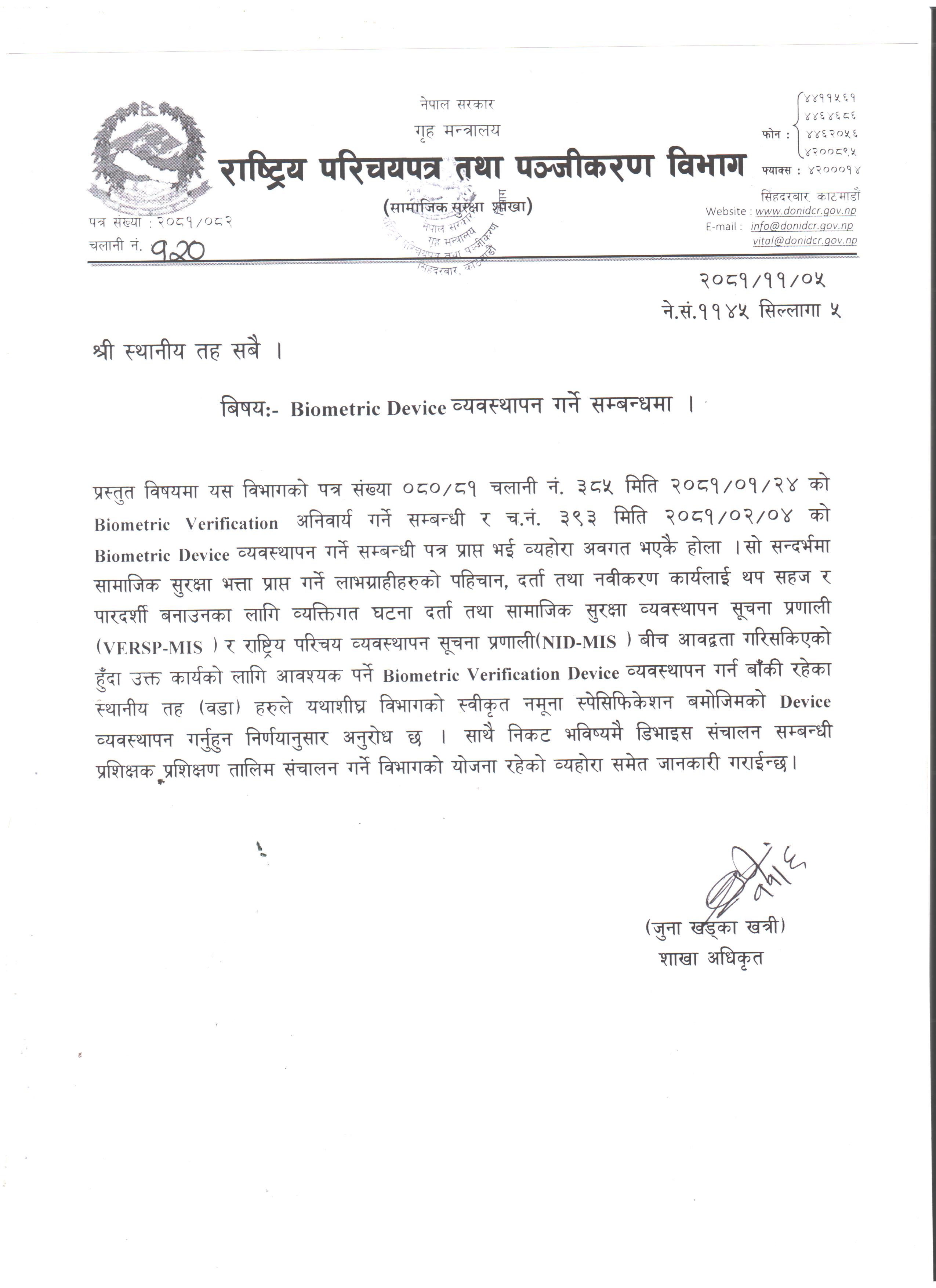 Biometric Device व्यवस्थापन गर्ने सम्बन्धमा |