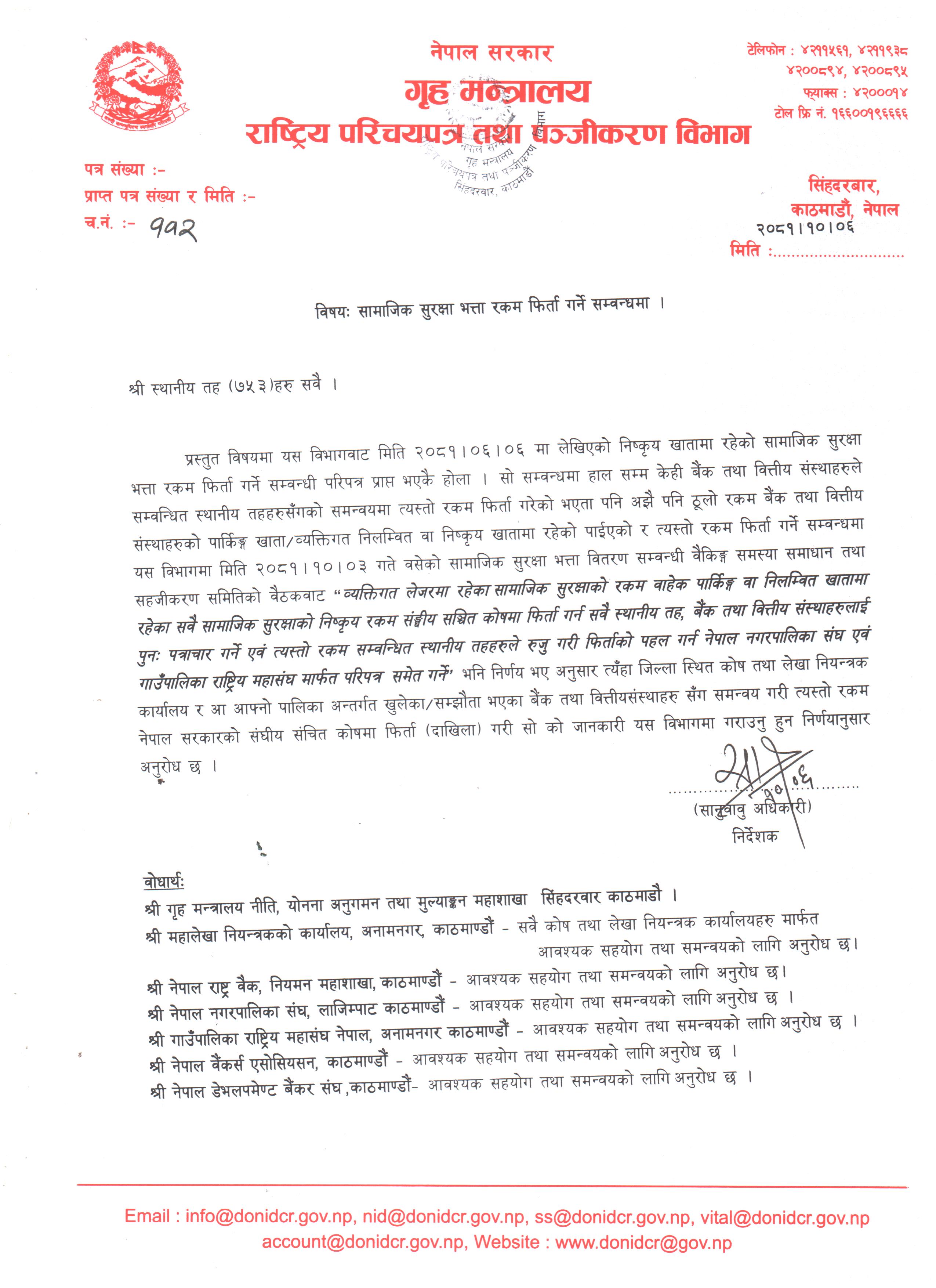 सामाजिक सुरक्षा भत्ता रकम फिर्ता गर्ने सम्बन्धमा। |