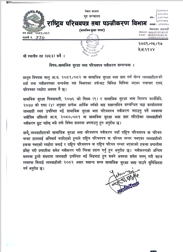 सामाजिक सुरक्षा भत्ता परिचयपत्र नवीकरण सम्बन्धमा |