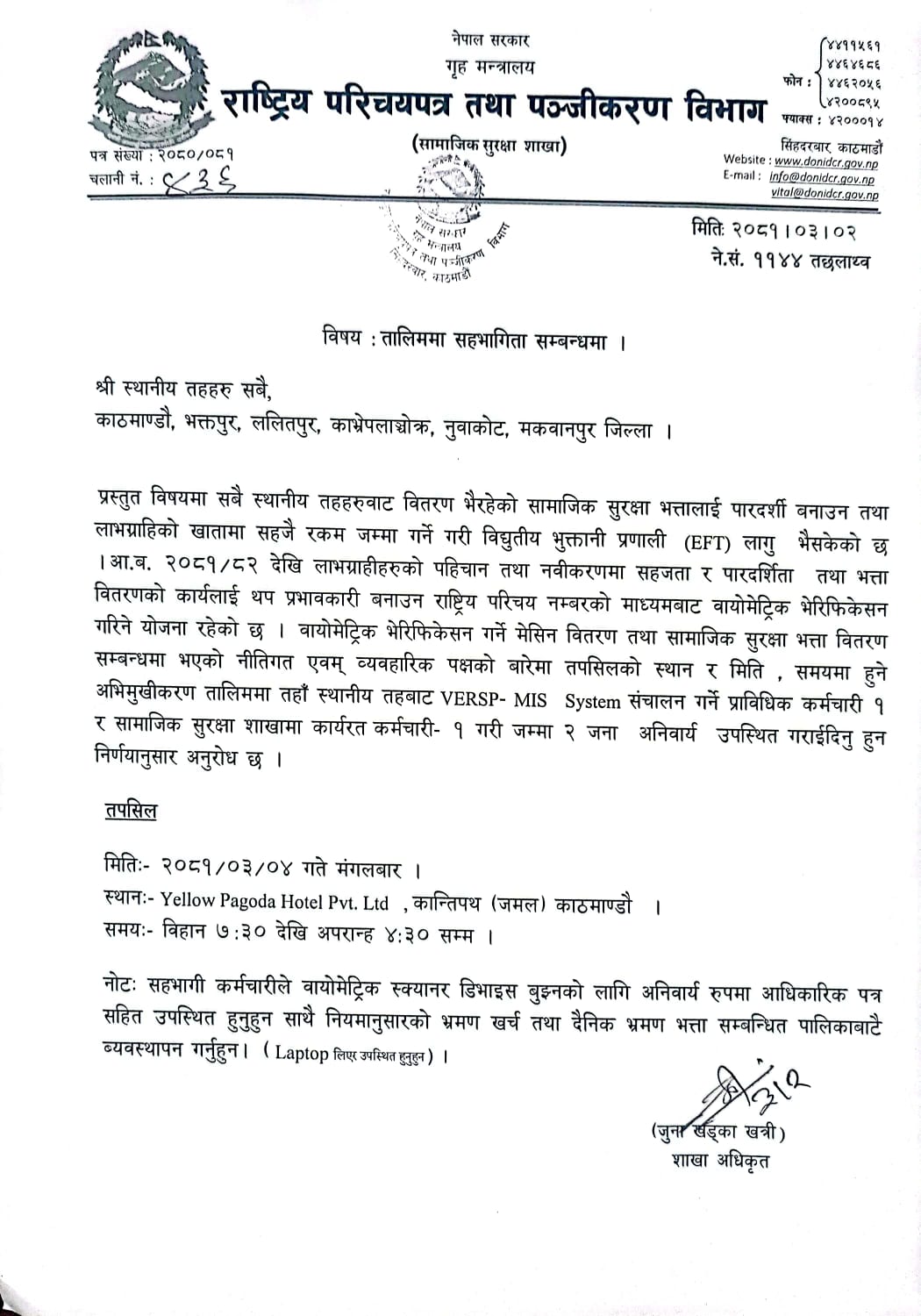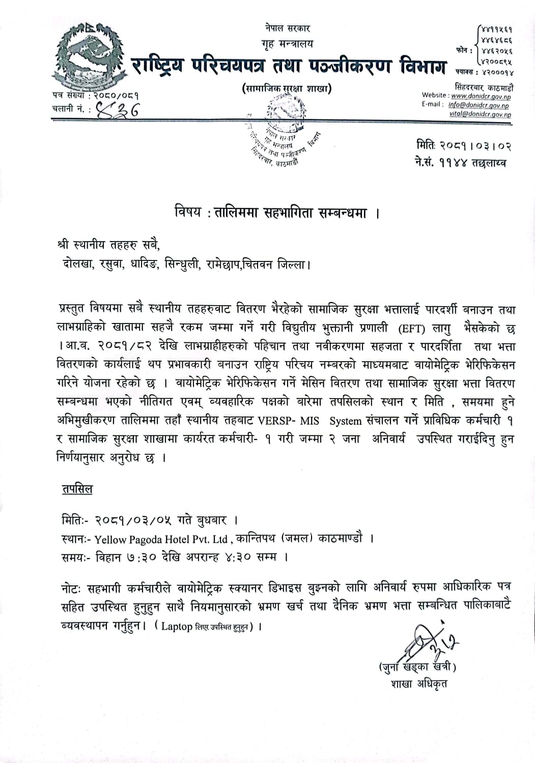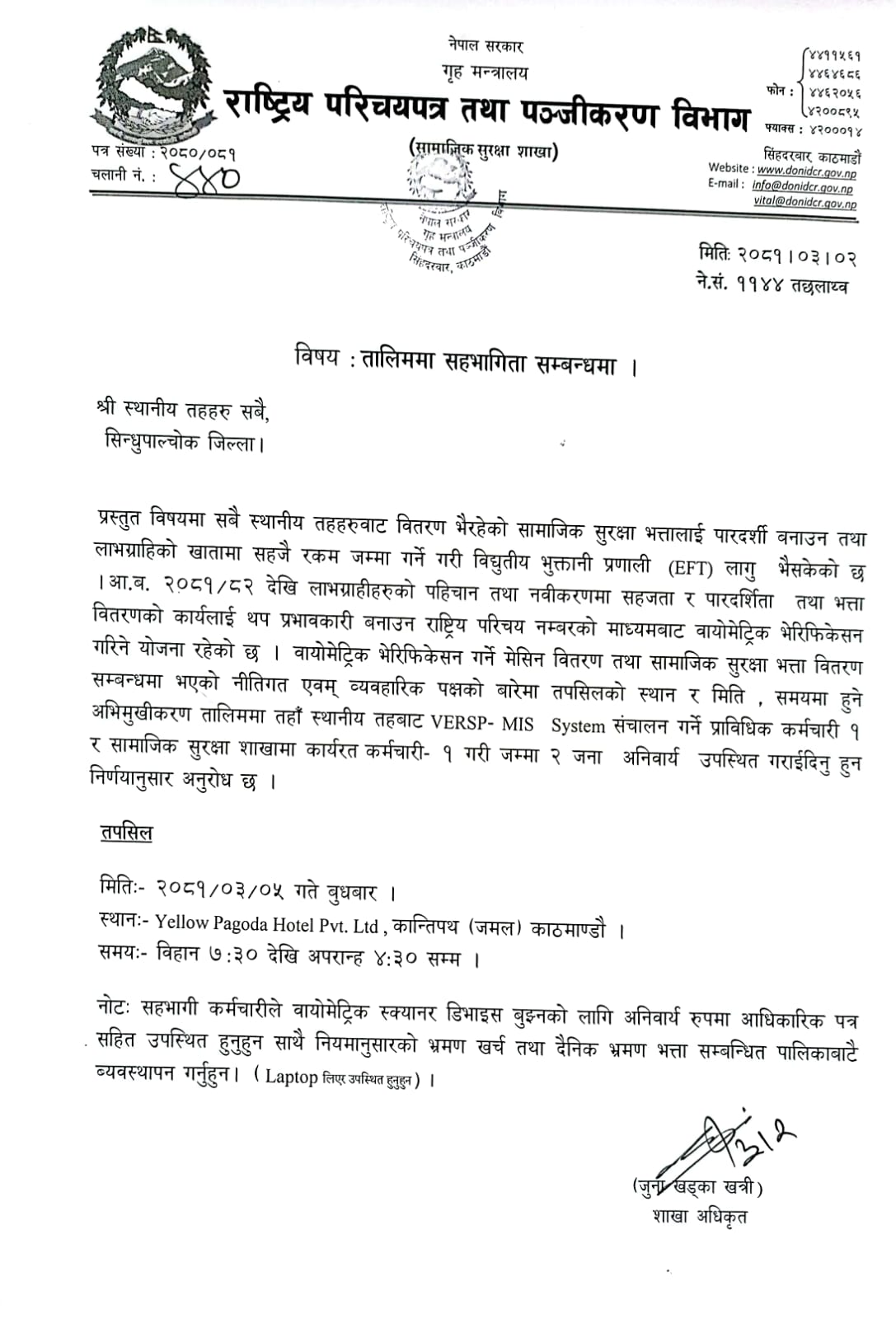 तालिममा सहभागिता सम्बन्धमा (सिन्धुपाल्चोक) |