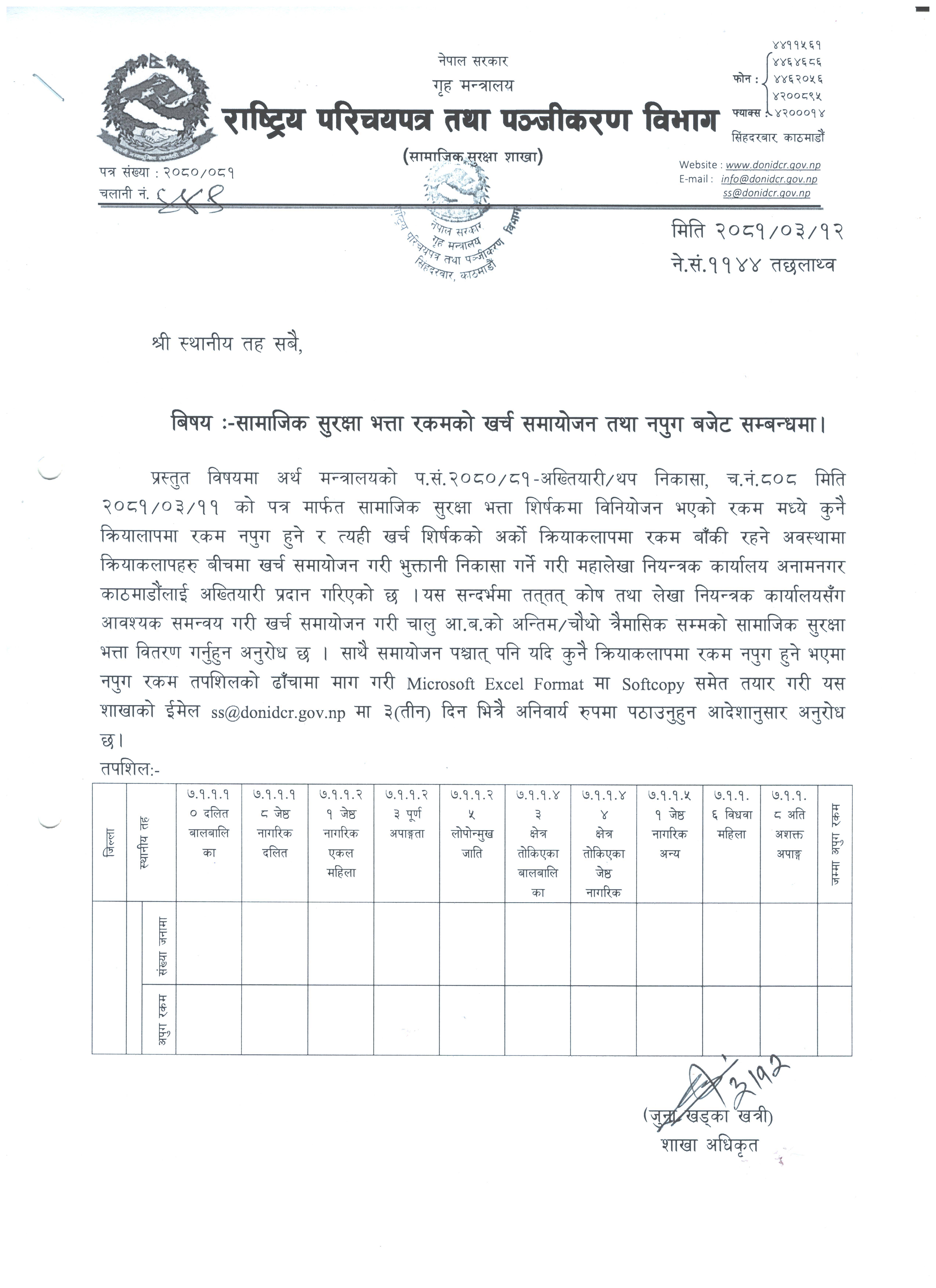 सामाजिक सुरक्षा भत्ता रकमको खर्च समायोजन तथा नपुग बजेट सम्बन्धमा |