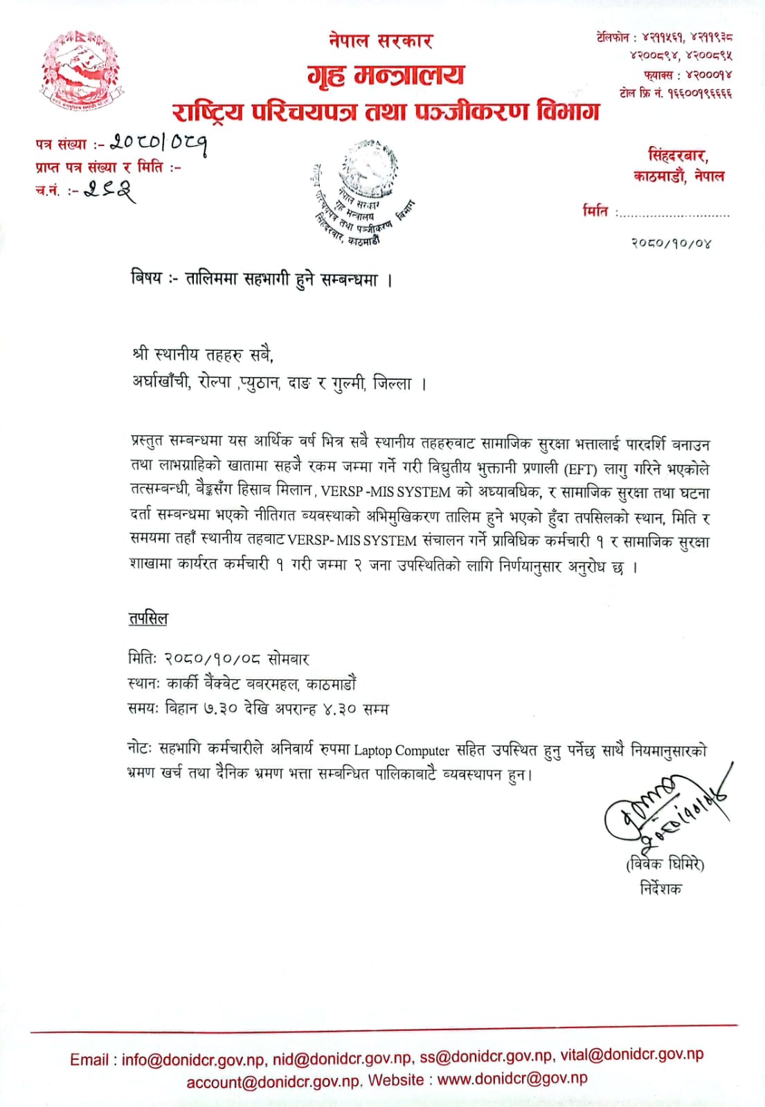 तालिममा सहभागी हुने सम्बन्धमा ।अर्धाखाची,रोल्पा,प्युठन,दाङ र गुल्मी । |